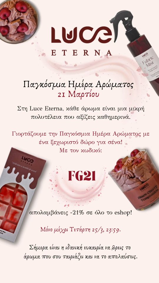 Στη Luce Eterna, κάθε άρωμα είναι μια μικρή πολυτέλεια που αξίζεις καθημερινά. Γιορτάζουμε την Παγκόσμια Ημέρα Αρώματος με ένα ξεχωριστό δώρο για σένα! Με τον κωδικό: FG21 απολαμβάνεις -21% σε όλο το eshop! Μόνο μέχρι Τετάρτη 25/3, 23:59. Σήμερα είναι η ιδανική ευκαιρία να βρεις το άρωμα που σου ταιριάζει και να το απολαύσεις
