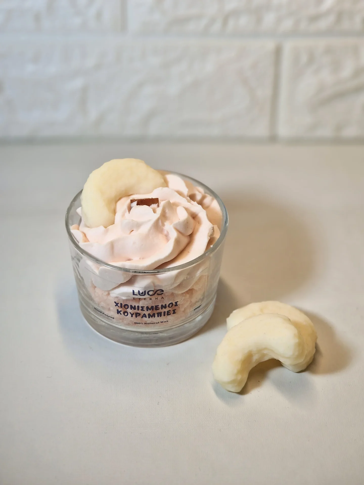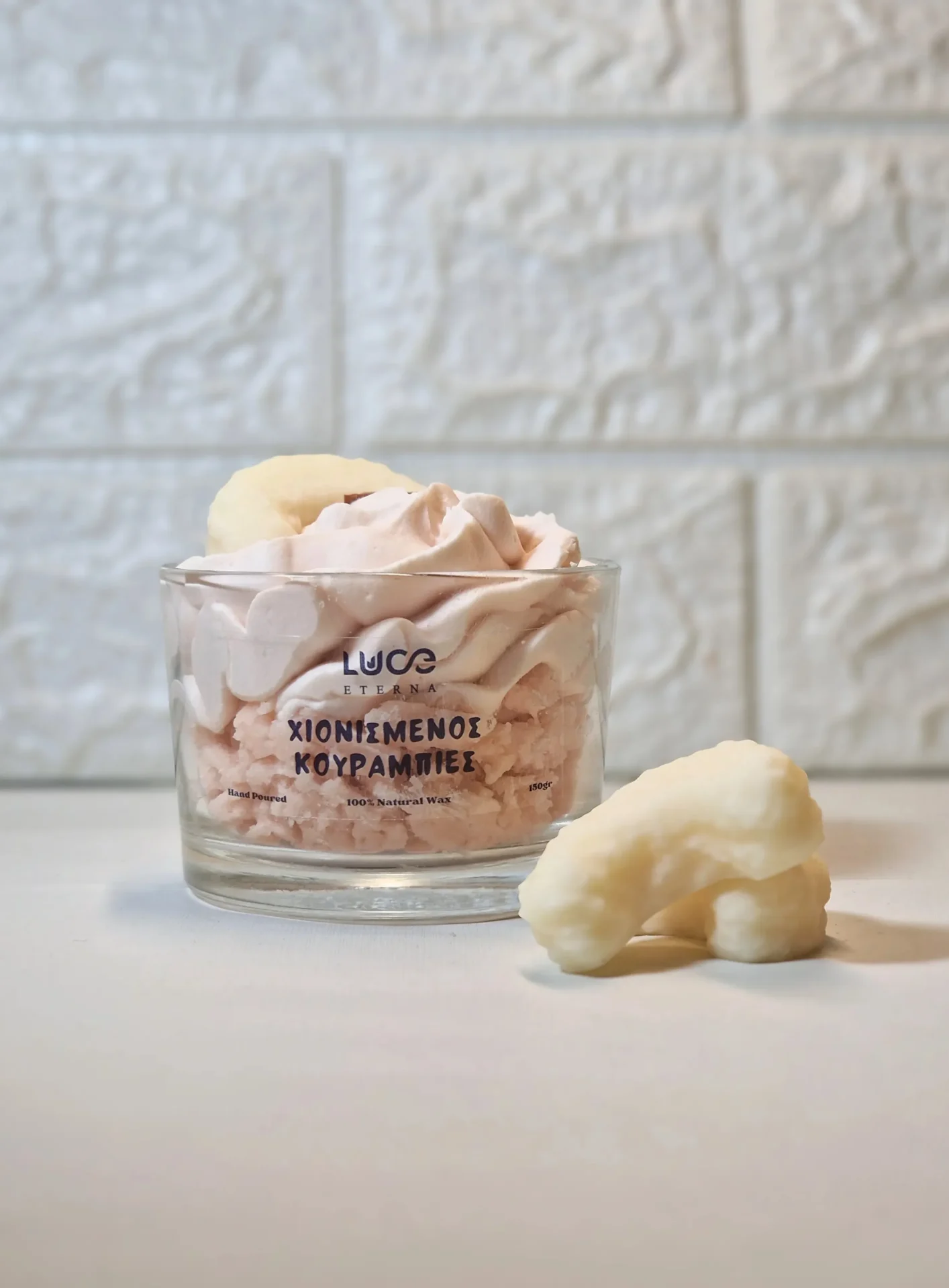 Ζήστε τη μαγεία των λευκών Χριστουγέννων με το αρωματικό κερί Χιονισμένος Κουραμπιές της Luce Eterna. Είναι ένα κερί που αιχμαλωτίζει την απλότητα και την κομψότητα των κλασικών γιορτών μέσα σε ένα σύννεφο γλυκιάς βανίλιας και φρεσκάδας.