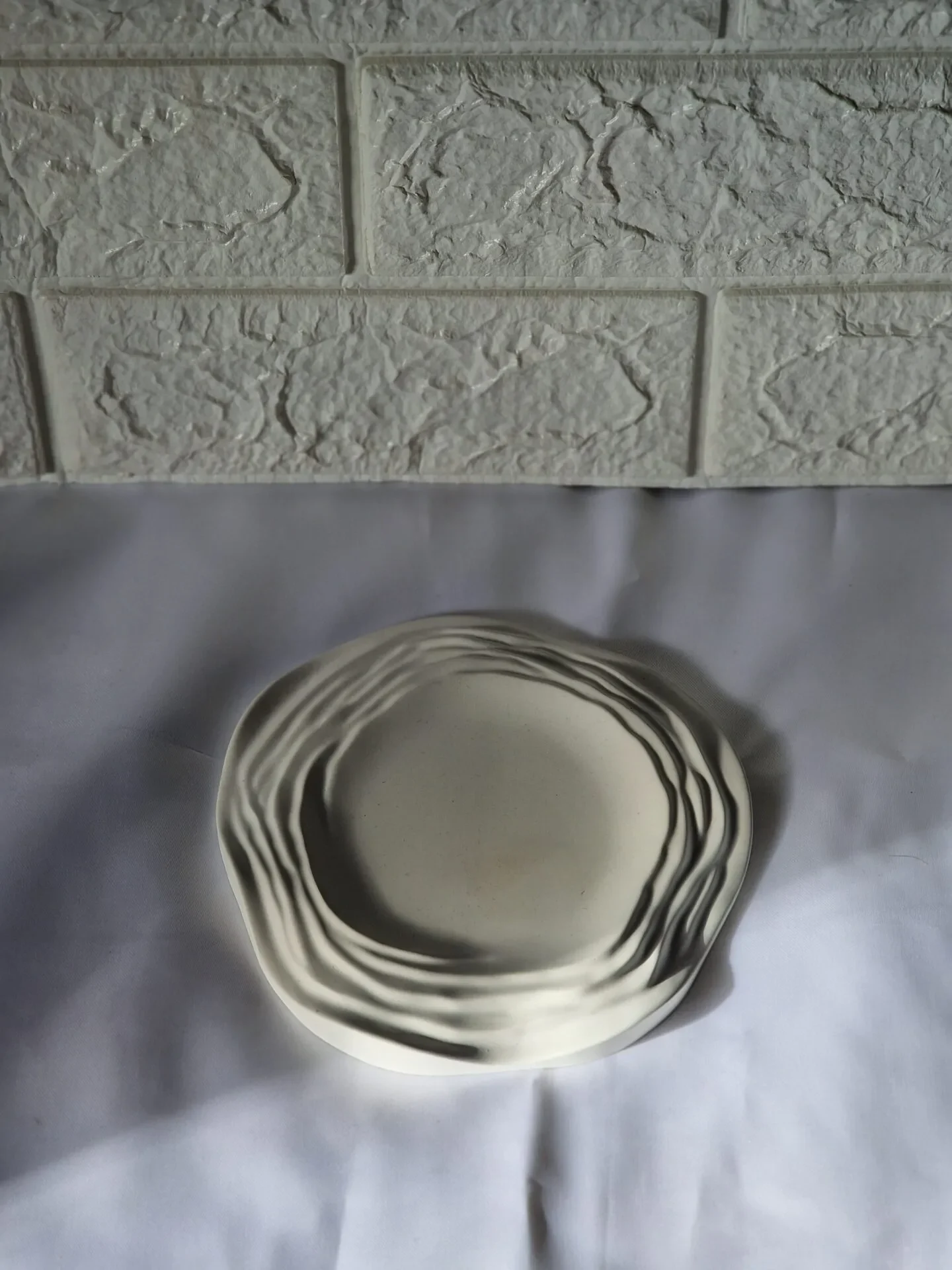 Αυτό το χειροποίητο διακοσμητικό πιάτο από πορσελάνη αποτυπώνει την ομορφιά της ατέλειας μέσα από το κυματιστό, ανάγλυφο σχέδιό του.